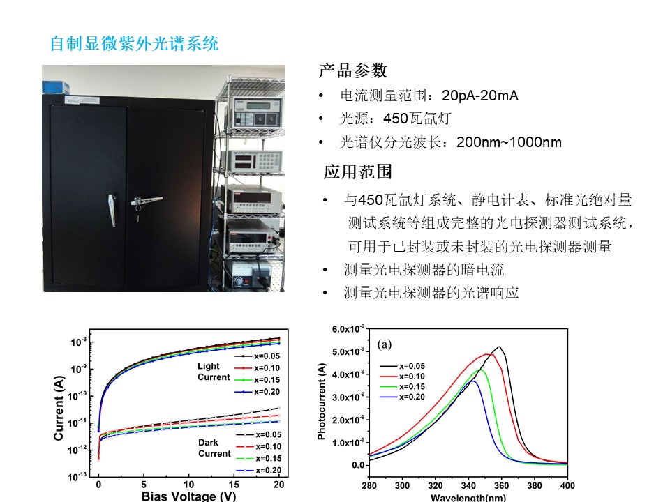 与450瓦氙灯系统、静电计表、标准光绝对量测试系统等组成完整的光电探测器测试系统,可用于已封装或未封装的光电探测器测量,测量光电探测器的暗电流,测量光电探测器的光谱响应。